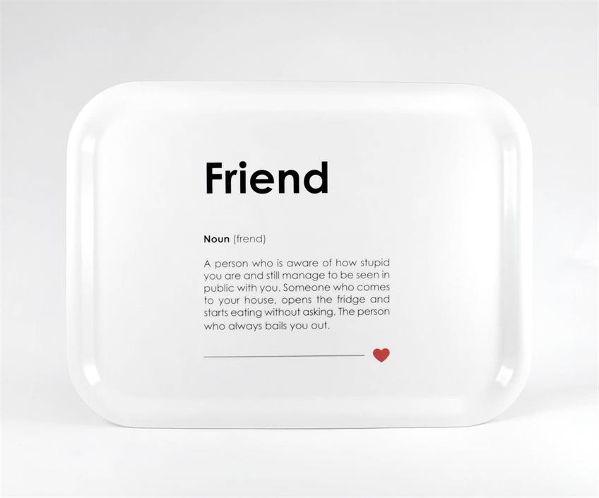 En fin bricka med ett underbart budskap om vänskap. Brickan har vit botten med svart text på engelska och ett rött hjärta. Brickan är tillverkad i Sverige och gjord av björkfanér.