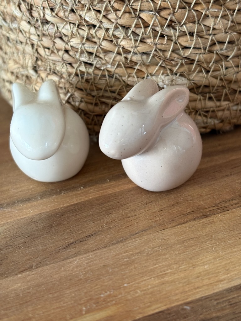 Ett underbart sött litet kanin par, i Latte nyans ena är lite mörkare och den andra ljusare. Så söta att duka med till Påsk eller låt de kura ihop sig på fönsterbrädan.