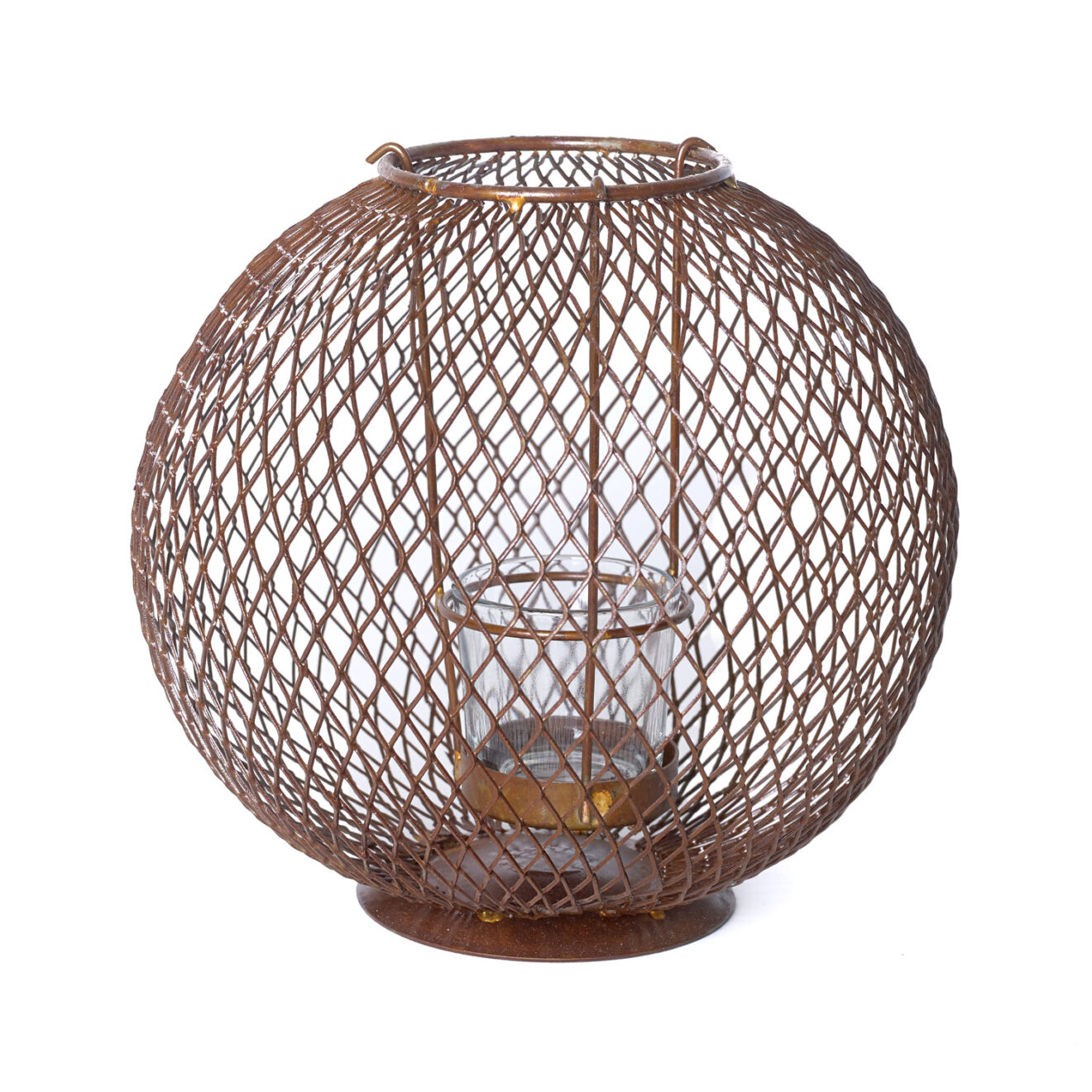 Rund fin ljuslykta för värmeljus i rostigt nät. En glaskopp gör att ljuset inte blåser ut även om du har lyktan utomhus. Snygg att ställa på trappen vid pumpan till hösten.